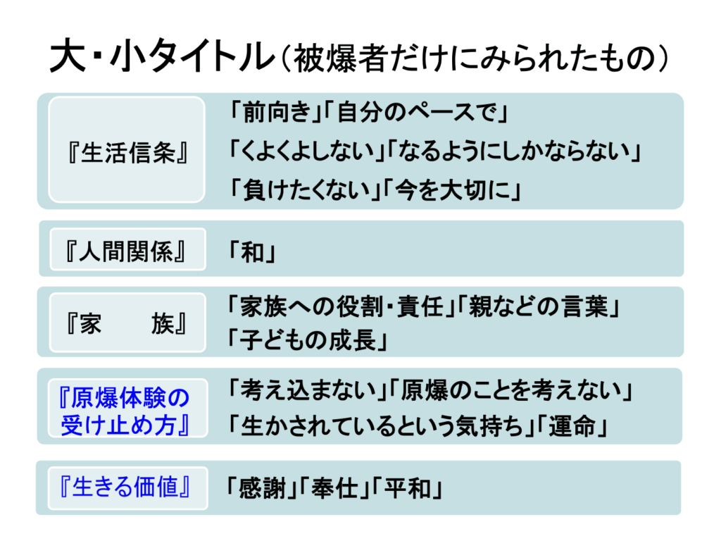 その結果、被爆者の方が非体験者よりもカテゴリー化されたタイトル数が多く、内容も多様だとわかりました。つまり、被爆者は人生の様々な苦しい局面を生き延びるために、多様な支えや考え方を必要とし、それらを実行してきたということです。被爆者だけにみられた大・小タイトルは表をじっくりご覧ください。